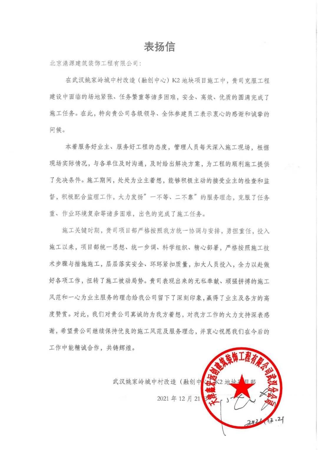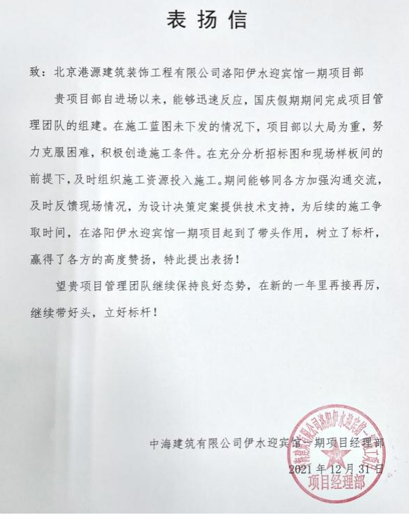 一封封表?yè)P信、感謝信,是對港源品牌的認可,也是對全體項目管理人員付出的肯定,更是鞭策我們不斷提高服務(wù)質(zhì)量的動(dòng)力。在今后的施工管理服務(wù)中,北京港源將堅持以“讓客戶(hù)更滿(mǎn)意”為宗旨,以適應客戶(hù)的多樣化需求。