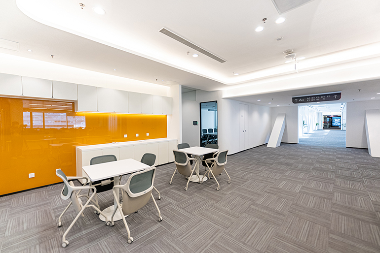 港源裝飾項目團隊深刻理解裝修材質(zhì)及色彩把控對空間塑造的重要性,在施工過(guò)程中靈活運用漸進(jìn)色、反差跳色,在以尚白為基礎色調的辦公區域,通過(guò)背漆玻璃的青白、木飾面固裝和無(wú)機涂料的乳白、鋼板天花的啞光白、鋁板飾面的雪白、瓷磚的米白,在簡(jiǎn)約中和諧地創(chuàng )造了豐盈的立體視覺(jué)享受,規避了呆板單一的視覺(jué)效果,創(chuàng )造了一個(gè)層次遞進(jìn)的白色美學(xué)空間。