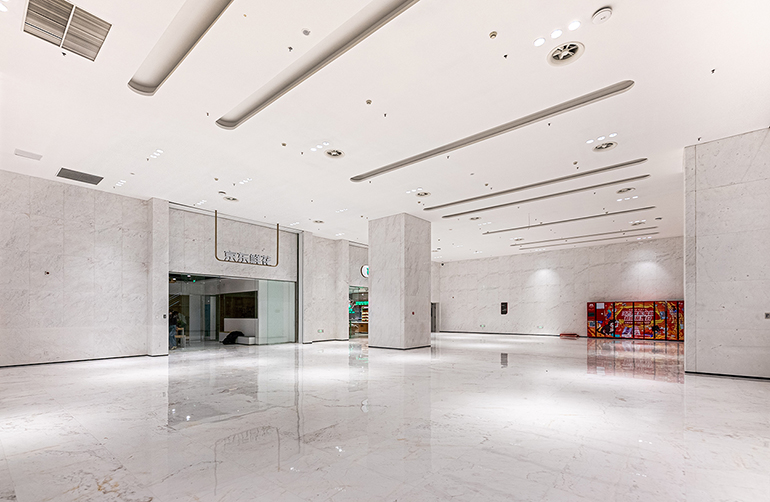 京東集團總部二期的地下一層訪(fǎng)客大堂結構挑高9米,大堂周邊墻體大部分二次結構為連鎖砌塊砌筑,且結構受力復雜。港源裝飾項目團隊經(jīng)過(guò)多方溝通及計算預排版,決定采用穿墻螺栓預焊接、墻體雙側對應布設埋板、局部連鎖砌塊灌注混凝土等綜合方式進(jìn)行鋼架龍骨焊接埋板的固定,以此規避了連鎖砌塊墻無(wú)法承重的缺陷,不僅避免增加甲方成本,也為大堂大空間墻面石材干掛的安全、穩定加上一道“雙保險”。